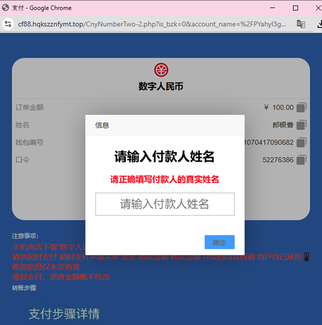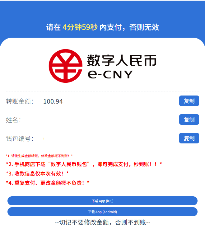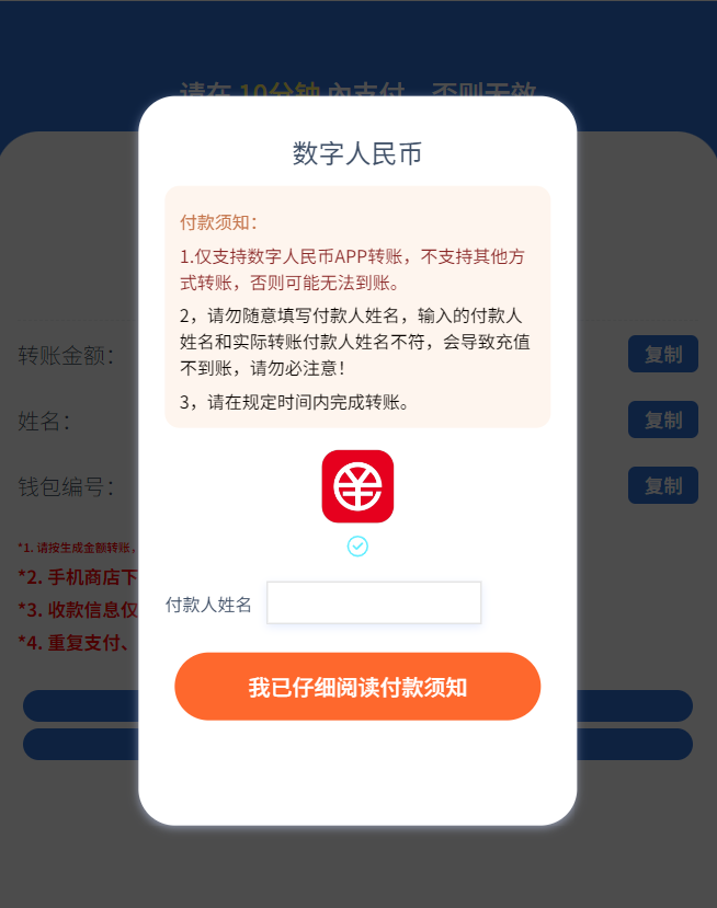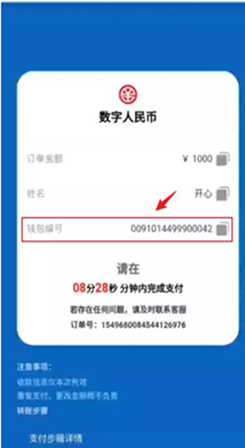 8. Input payer name and and copy the Wallet Code then open the Digital Yuan App.