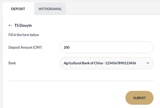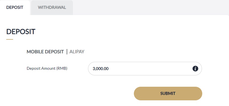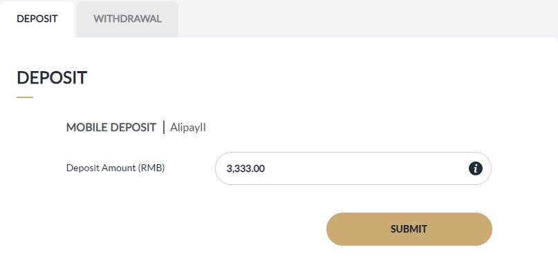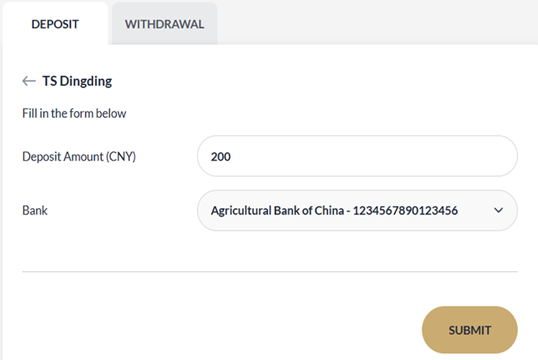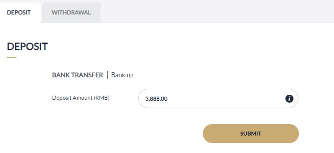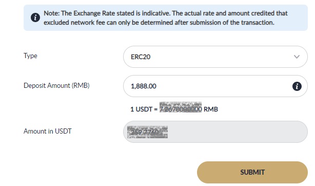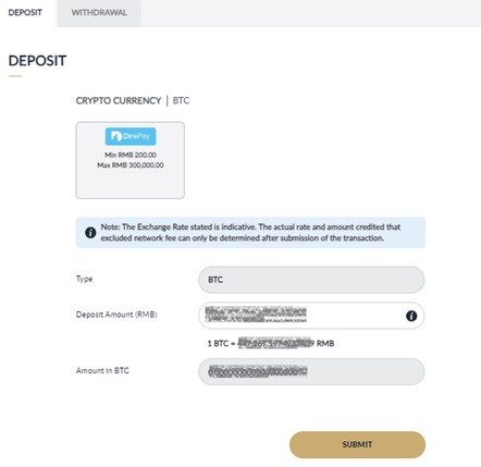 2. Choose DirePay, Input Deposit Amount and click submit. Note: The exchange rate stated is indicative. The actual rate and amount credited can only be determined after submission of the transaction.