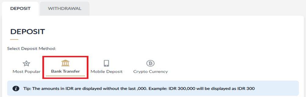 - Click "DEPOSIT" tab → Click "BANK TRANSFER" → Click "LOCAL BANK TRANSFER DY".