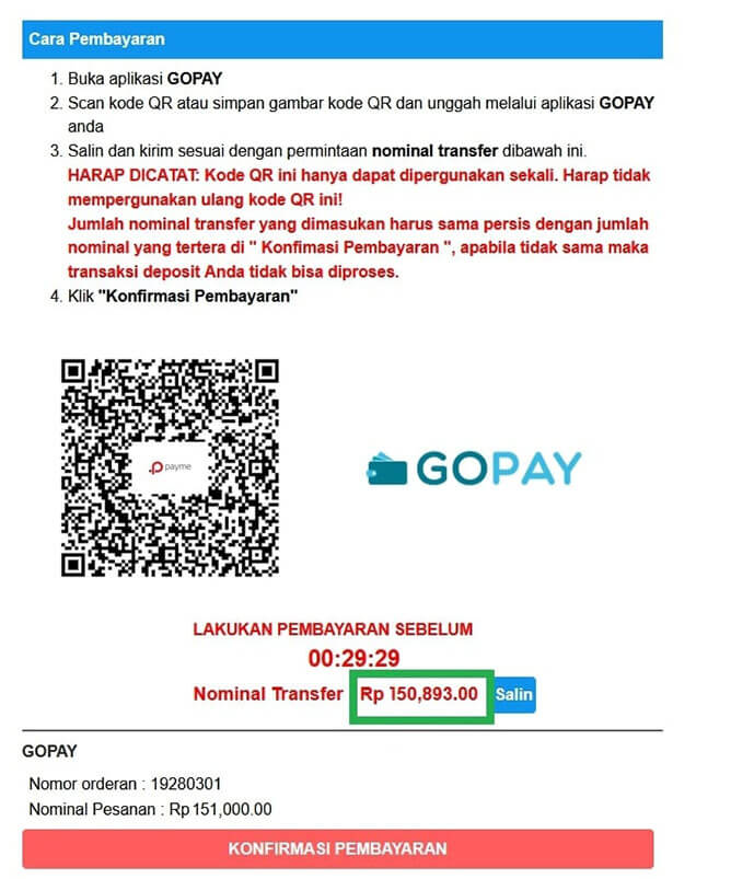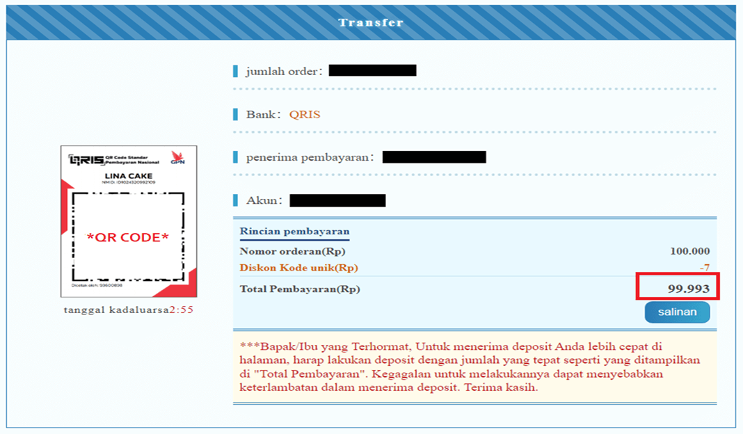 - Scan the QR Code and transfer immediately according to total payment request (unique amount).