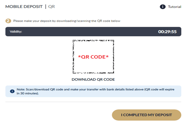 - Scan the QR code and transfer immediately. After that, click "I COMPLETED MY DEPOSIT".