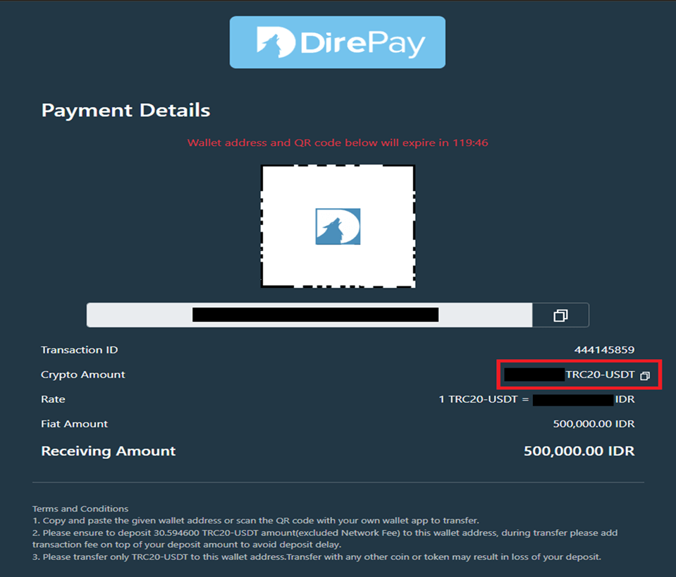 - Scan the QR code and fill the "CRYPTO AMOUNT" in your crypto wallet account. Make sure to choose the correct channel (TRC20).