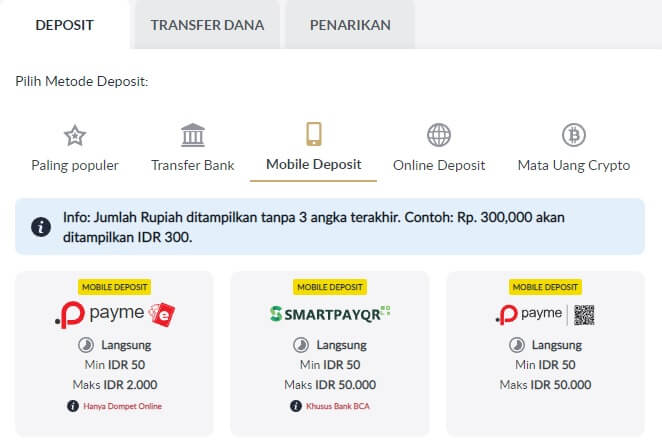- Click "DEPOSIT" tab → Click "MOBILE DEPOSIT" → Click "QRIS P2M".