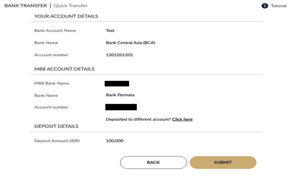 - Click "DEPOSIT" tab → Click "BANK TRANSFER" → Click "QUICK TRANSFER".