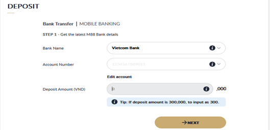 - Our bank account where you can transfer your deposit will be displayed, Do deposit from your bank to M88 bank account then click "SUBMIT"