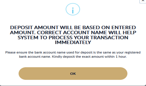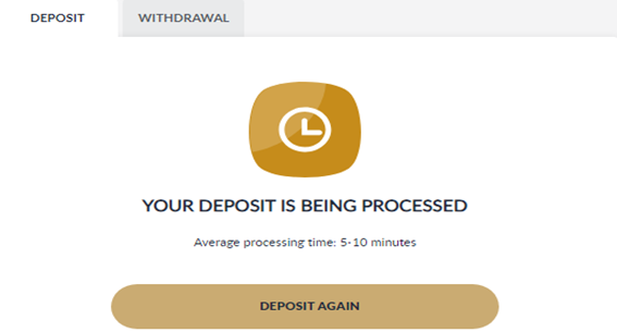 - Deposit will be processed within 5 – 10 minutes estimation time
