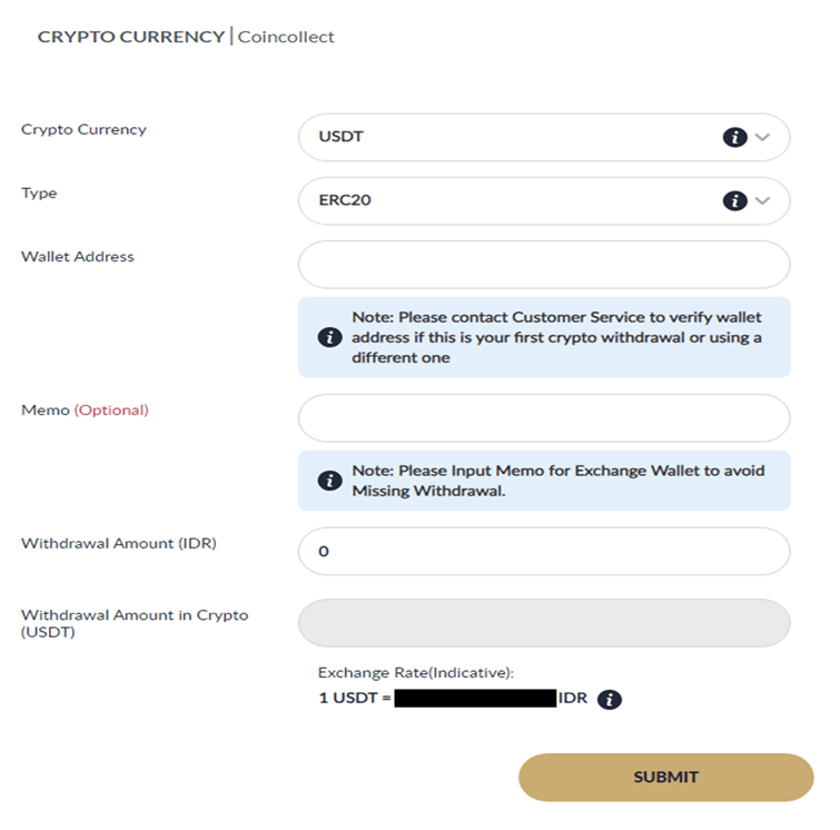 - Choose the channel "TYPE" (ERC20 or TRC20) → Input "WALLET ADDRESS" → Input the withdrawal amount → Click "SUBMIT".